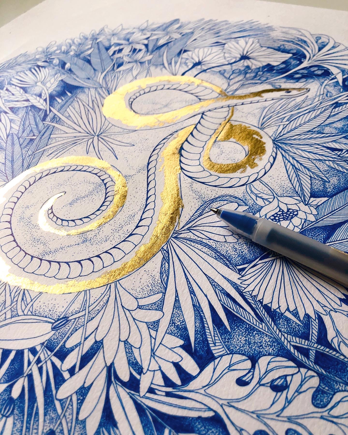 À travers le dessin, le pointillisme et l’or, j’explore les liens entre le corps, la nature et les symboles ancestraux.