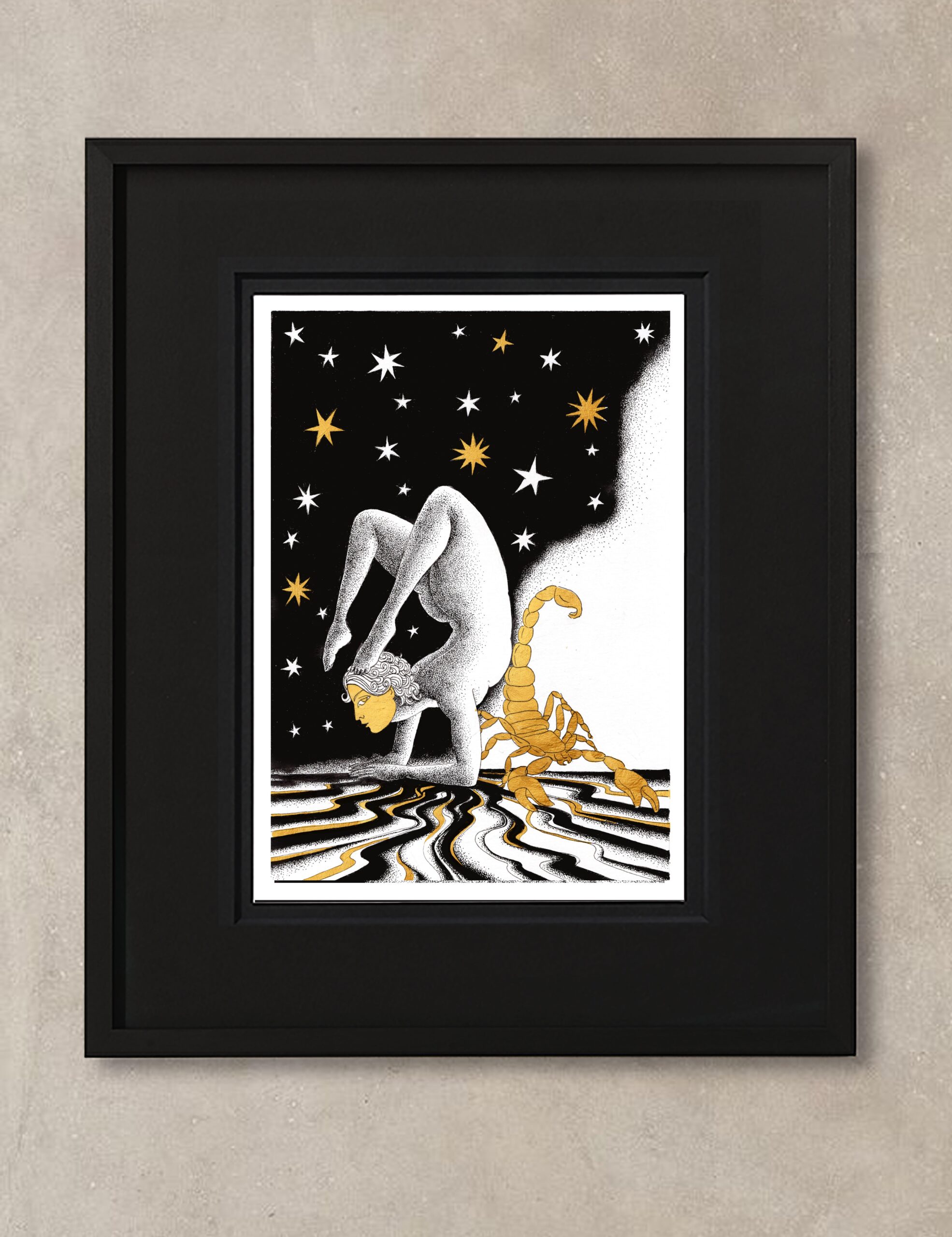 Cette illustration astro Scorpion incarne la dualité et la puissance de ce signe. Une figure humaine, cambrée en posture acrobatique, exprime la maîtrise de soi et la souplesse. Ses traits, mêlant force et mystère, se fondent dans une scène étoilée. À ses côtés, un scorpion doré, majestueux, symbolise la régénération et la vigilance. Les lignes dorées et ondulantes du sol reflètent les courants émotionnels profonds, qui évoluent sous une voûte céleste étoilée. Cette œuvre vibrante traduit le voyage intérieur et l’intensité unique du Scorpion.