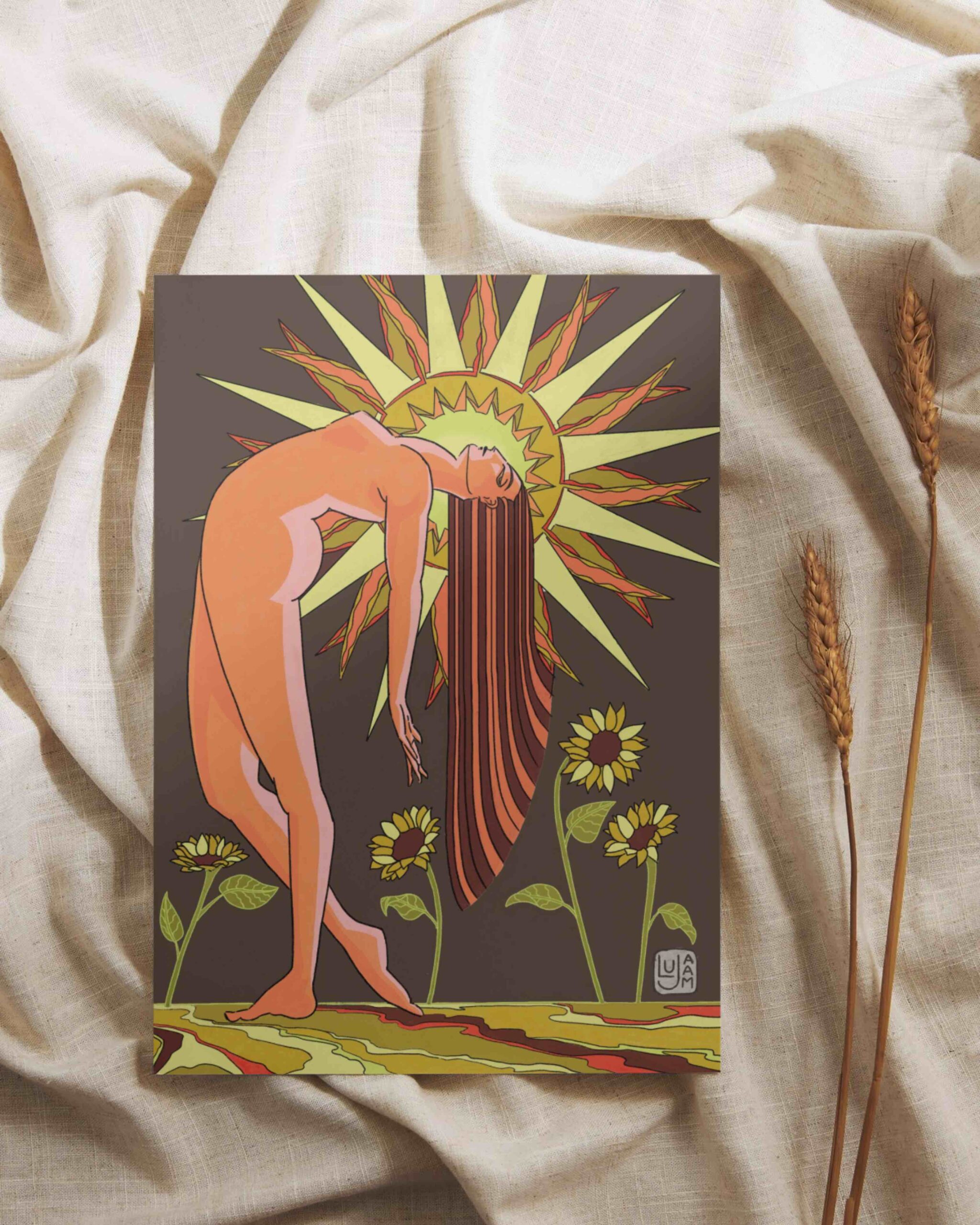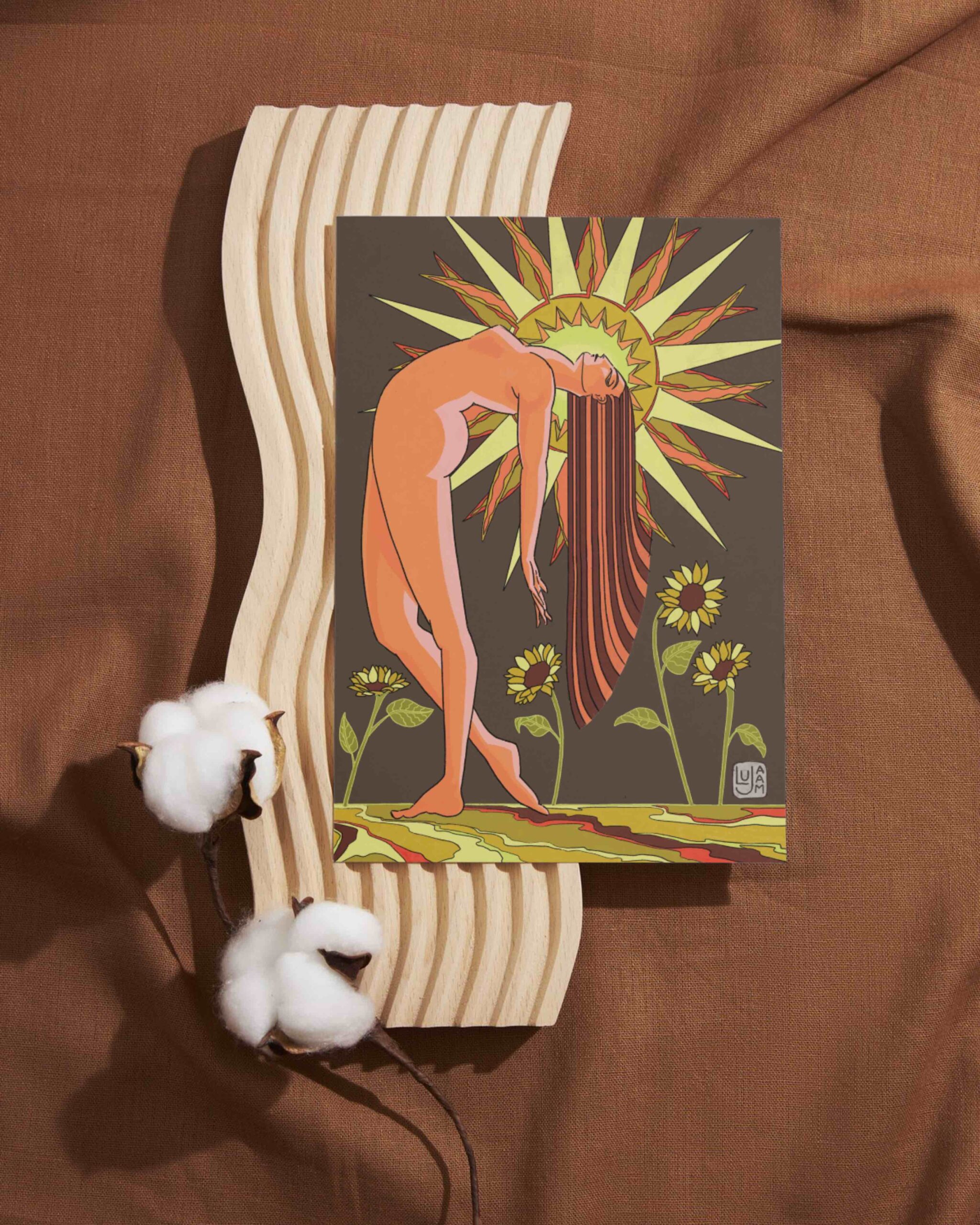 Une carte vibrante où l’énergie solaire embrasse la grâce féminine dans un éclat de lumière et de chaleur.